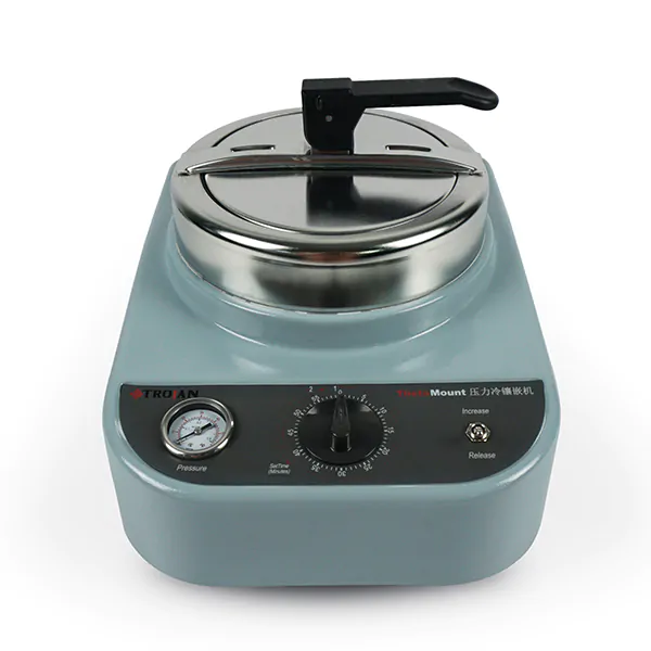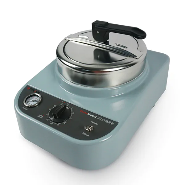 The Theta Mount Cold cold-mounting press is ideal for cold embedding using both epoxy and acrylic resins. Thanks to its pneumatic system, the press does not require any external power supply to effectively cure all types of samples. The Theta Mount Cold press is designed to offer the operator maximum safety and comfort during use. The device features a quick-lock and release system, a water separator, and quick couplings. A built-in precise timer increases user convenience and eliminates the need for additional equipment when performing the mounting process. The stabilization performed with the Theta Mount Cold press does not alter the physical or chemical properties of the resin.