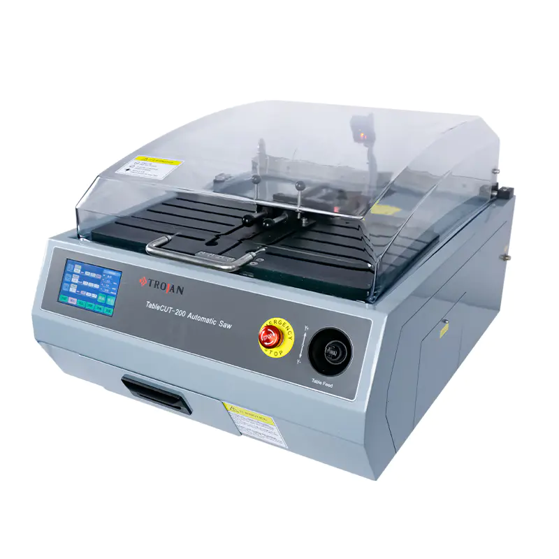 TableCUT-200 to automatyczna precyzyjna przecinarka, wyposażona w różne uchwyty umożliwiające cięcie nieregularnych elementów. Nadaje się do precyzyjnego cięcia różnych materiałów, w tym metali, płytek PCB, półprzewodników, kryształów, ceramiki, szkła kwarcowego oraz próbek skał.