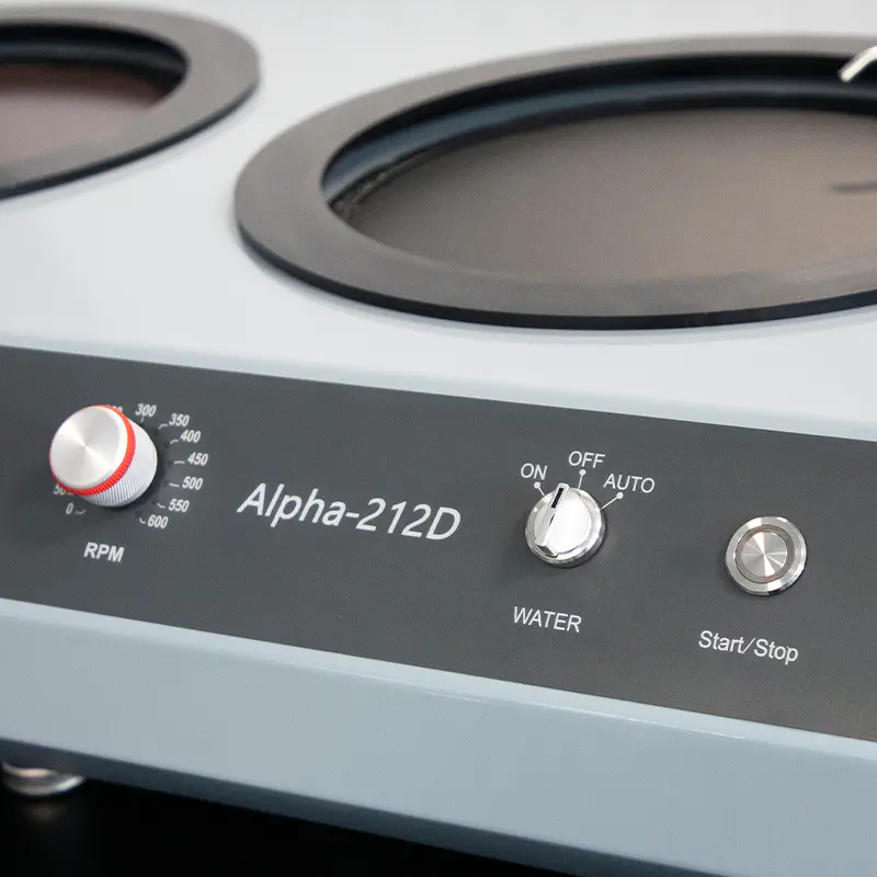 Alpha-212D to nowo zaprojektowana szlifierko-polerka z indywidualnym panelem sterowania na podwójnych tarczach o średnicy 10″/12″ (254/305 mm). Maszyna jest łatwa w obsłudze i stabilna, szczególnie przydatna do szlifowania i polerowania próbek o dużych rozmiarach.